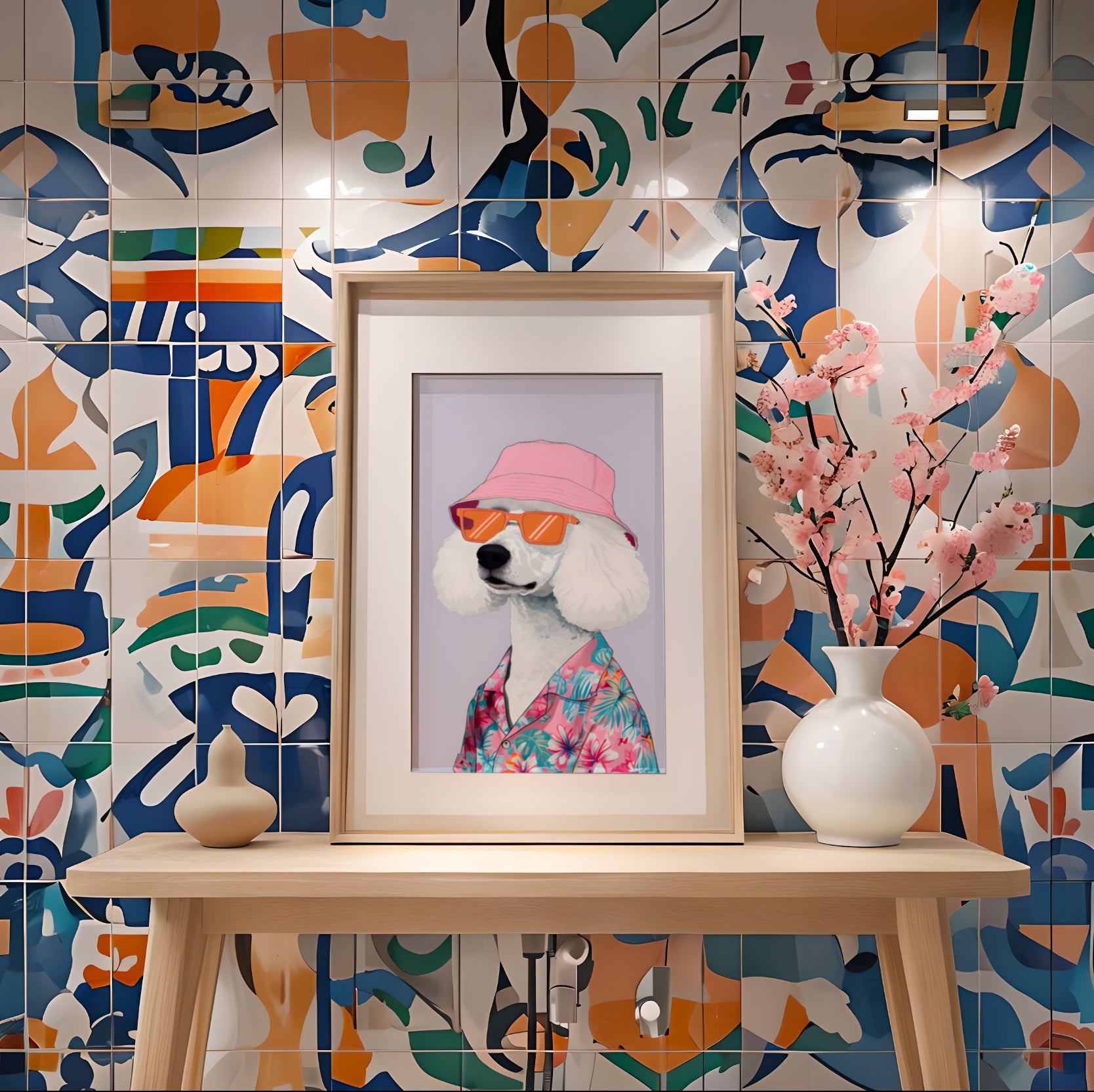 Bring a touch of summer style and humor to your walls with this high-resolution digital artwork featuring a chic white poodle dressed in a pink bucket hat, orange sunglasses, and a floral shirt.